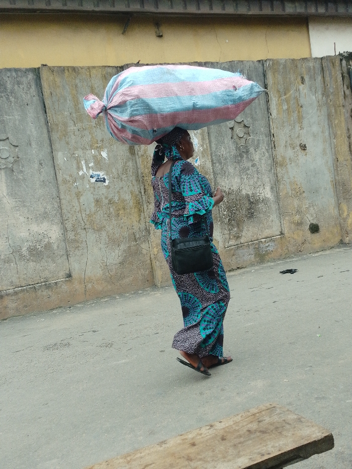 In Agani, Nigeria, a single adult female is depicted walking from the viewer's right to left on an asphalt roadway. She carries a large, horizontally striped bag, predominantly light blue and red, balanced centrally on her head. The bag is cinched and tied at its left end. The woman is dressed in a long, flowing garment with a teal, blue, and black geometric pattern, paired with a matching headwrap. A black shoulder bag with a textured front flap is slung across her body. She wears dark-colored sandals. In the background, a weathered concrete wall, approximately 2 meters in height, extends horizontally across the frame. This wall exhibits areas of discoloration, several affixed paper fragments (possibly posters), and a faint circular, star-like embossed pattern near its center. Above the concrete wall, a section of a light yellow building facade is visible. The foreground contains a portion of a rough, light-colored wooden plank, positioned horizontally at the bottom right. The environment appears to be an urban street or thoroughfare.