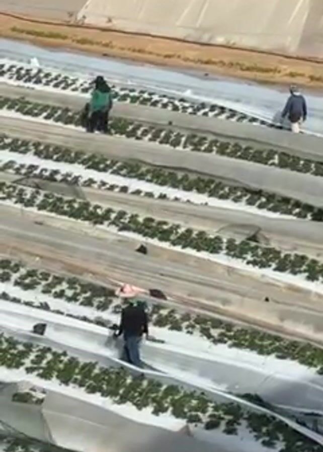 n elevated view of a field with workers tending to rows of plants. The field appears to be covered with translucent material, likely to protect the plants. There are at least three people visible, spread out along the rows, presumably working on the plants. They are wearing clothing suitable for outdoor work, with one wearing a hat. The plants are green and appear to be low-growing. The overall setting suggests an agricultural environment, possibly a commercial farm or greenhouse. The focus is on the workers and their activity in the field.