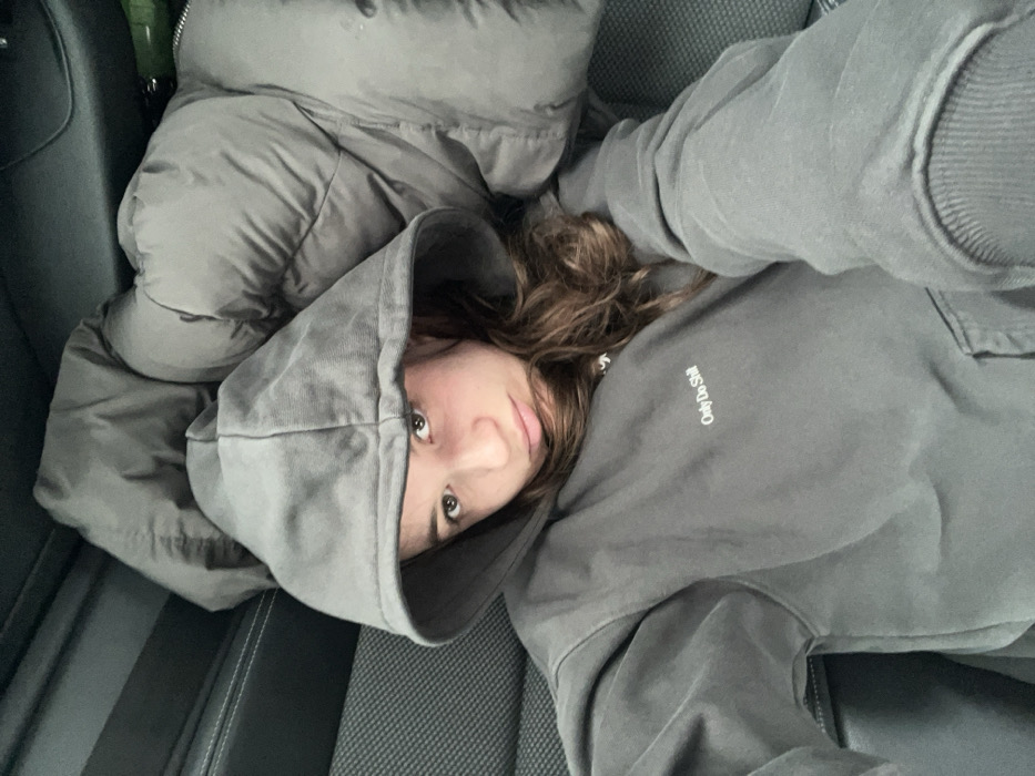 A young individual, appearing to be female, is depicted reclining within the interior of a vehicle, positioned at a slight angle with her head towards the upper left. She wears a dark grey hooded sweatshirt with the text "Only Do Still" printed in white on the chest; the hood is pulled over her head. Her medium-length brown hair is visible around her face and shoulders. Her gaze is directed towards the camera with a neutral expression. To her right, a grey, padded object, possibly a jacket or blanket, is visible. The vehicle's interior features dark grey upholstered seats with a discernible pattern and a visible seatbelt mechanism with light stitching on the upper left. The image lacks specific visual identifiers to determine a precise location within Stara Pazova Municipality, Serbia.