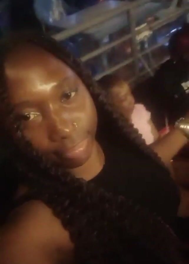 A woman with long braids looks directly at the camera and moves slightly. She is wearing a black shirt. The background appears to be a crowded indoor venue, possibly a bar or club, with other people visible in the background. The lighting is dim with some colored lights.