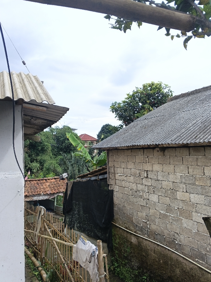 A view of several buildings with corrugated roofs and block walls. A black net hangs adjacent to a fence made of sticks with clothes drying on it. Lush green foliage and banana leaves are visible in the background. A glimpse of a red-roofed structure sits further away. Overhanging branches and power lines are also in the frame.