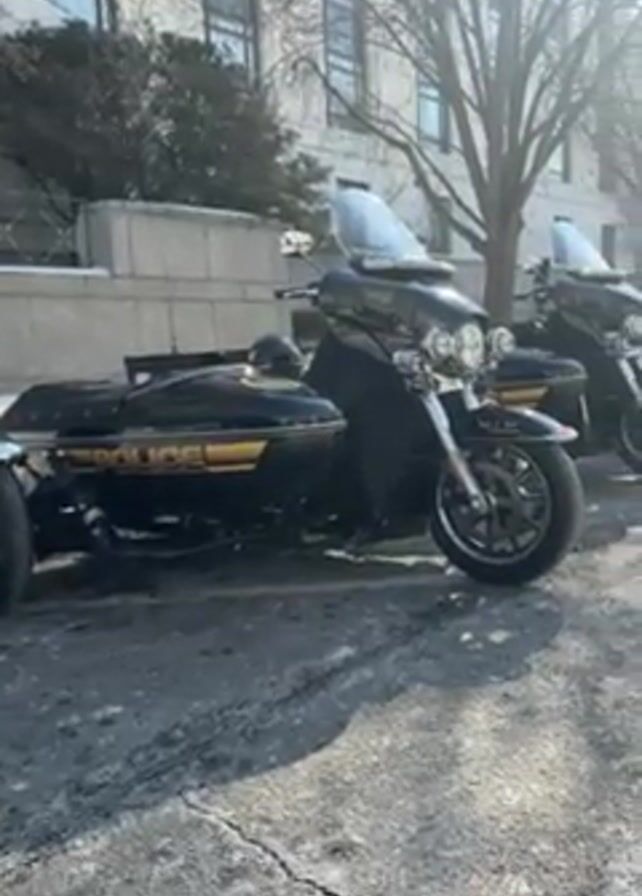police officers and vehicles outside a government building. The scene is outdoors, with a view of a light-colored building that has multiple windows. In the foreground, a row of police motorcycles with sidecars are parked. The motorcycles are black with gold accents and labeled "POLICE" on the sidecar. The road or parking area is gravel and patchy with what appears to be remnants of snow or ice. In the background, there are other vehicles parked, including SUVs and sedans. A group of police officers in dark uniforms are gathered near the vehicles, interacting with each other. The sky is clear and sunny, but the trees are bare, indicating it is likely winter or early spring.