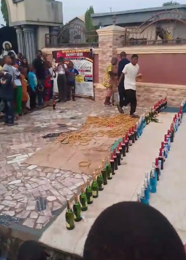 The video depicts a group of people gathered outside a building. A line of glass bottles is arranged on the ground, and a man is attempting to walk across them without knocking them over. There is a small group of children watching the man. In the background, there is a banner with the words "DIVINE GLORIOUS SUMMIT 2023" on it. The area appears to be a courtyard or open space. The building's architecture suggests it may be a church or religious institution.