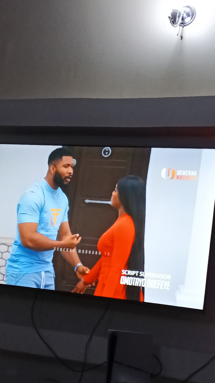 A man in a light blue shirt argues with a woman in an orange dress on a TV screen. The setting seems to be a hallway with a dark brown door. The TV displays the "Uchenna Mbunabo TV" logo and the text "Script Supervisor Omotayo Odefeye". The TV screen fills most of the frame, with a grey wall and a wall-mounted light fixture visible above it. Cables dangle below the TV.