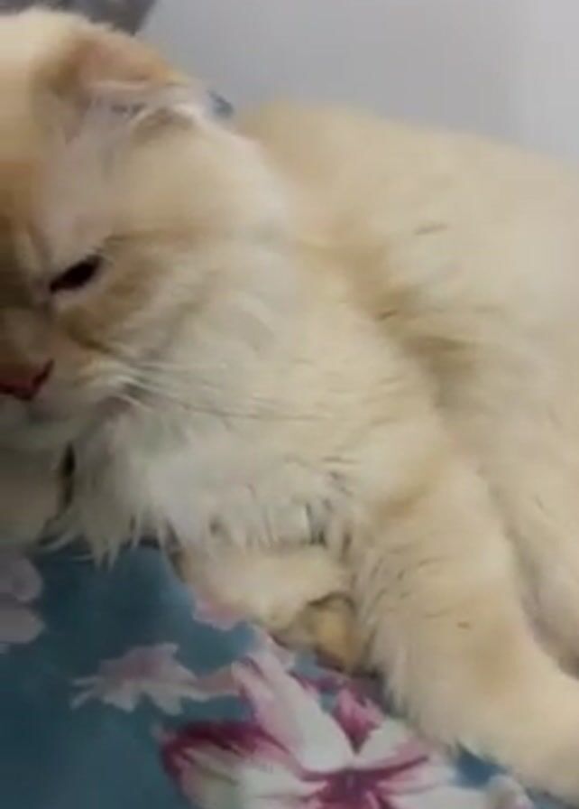 A close-up shot shows a fluffy, tan-colored cat lying on a blue floral-patterned surface