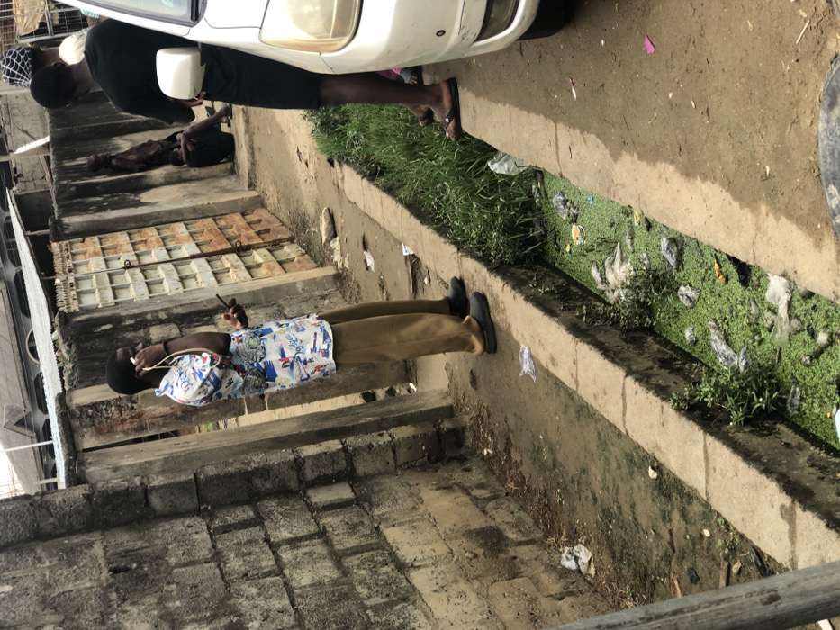 A street scene features a drainage ditch choked with green aquatic plants and litter. A person stands beside the ditch, clad in tan pants and a patterned shirt, using a phone. Nearby, another person in a black shirt stands by a white car. A third individual lies on a concrete step in the background. The surroundings include brick walls and buildings with metal grilles, indicating an urban environment.