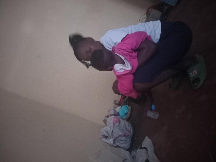 A woman in a white shirt and dark pants kneels, holding a child wearing a pink sweater. The child is nestled against her chest. The scene is indoors, possibly in a room with a light-colored wall and a dark floor. Clutter, including clothing and containers, is scattered on the floor around them. The lighting is dim. The woman wears slippers on her feet.