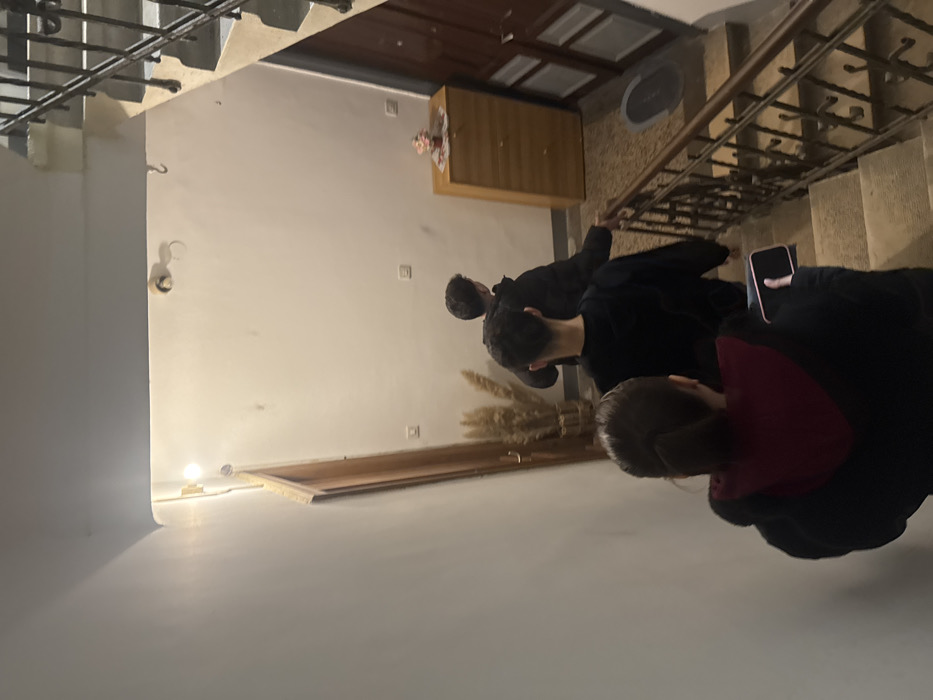 The image depicts an interior residential staircase in Grad Rijeka, Croatia. Three individuals are observed descending a stone or concrete staircase, viewed from an elevated perspective behind the foremost person. The person closest to the camera has dark hair styled in a ponytail, wears a dark jacket with a burgundy inner lining, and holds a dark smartphone horizontally in their right hand. Ahead of this individual, a second person, also with dark hair and wearing a dark jacket, descends the stairs. A third individual, similarly dressed in a dark jacket, is positioned further down the staircase, leading the descent. All subjects are oriented away from the camera. The stairwell walls are painted a light, off-white color. A wall-mounted light fixture with an exposed bulb provides illumination from the upper left wall. On the landing visible below, two wooden doors are present. To the left, a tall arrangement of dried pampas grass or similar reeds stands in a container near a light-colored doorframe. To the right, a light-toned wooden cabinet with three drawers is positioned against the wall, topped with a small floral decoration. A dark, circular doormat lies on the floor in front of a darker, possibly double-leaf, wooden door. Several square, light-colored electrical outlets or switch plates are visible on the walls. The floor of the landing consists of patterned tiles in brown and beige tones. The staircase features a dark metal railing with decorative balusters on the right side.