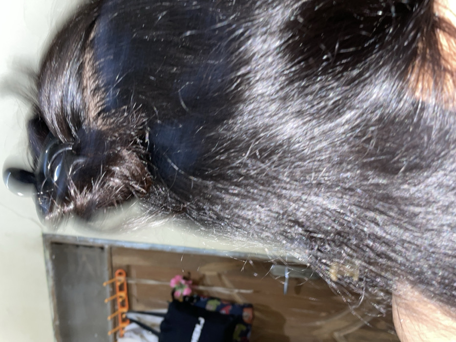 A close-up, upward-angled image shows a human subject's dark hair, gathered and secured at the crown with a black claw hair clip