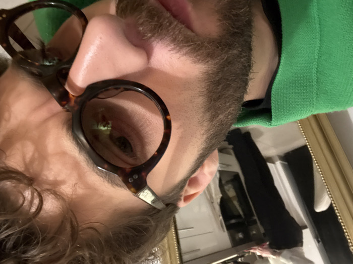 A selfie shows a man with brown curly hair, a beard, and glasses. The glasses have tortoiseshell frames. He is wearing a green top and a black shirt. The photo is taken from an unusual angle, showing mostly the side of his face. The reflection in the glasses shows a room with a mirror, clothes hanging, and a table. The selfie is seemingly taken in a bedroom or closet area.