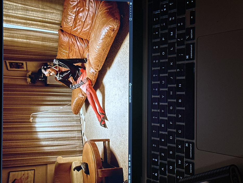 A photograph displays an image on a laptop screen, set beside the laptop's keyboard. The image on the screen shows a vintage, possibly 1970s, interior scene with a woman in a black jacket and red stockings posing on a large, brown leather armchair. The room features striped wallpaper, a small table, and a lamp. The laptop keyboard is partially visible, with keys illuminated. The surrounding environment is dimly lit, casting shadows on the laptop and keyboard.