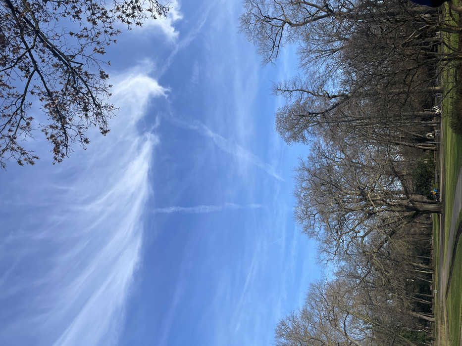 The image depicts a park scene in Erlangen, Germany, under a clear blue sky. High in the atmosphere, several distinct white cirrus clouds form wispy, feathered patterns, predominantly in the upper left and central-right. Multiple contrails are visible; a prominent vertical one descends through the center, intersecting fainter, more diffused contrails that form a loose 'X' shape in the upper sky. The lower two-thirds of the image show a landscape dominated by numerous deciduous trees, mostly bare of foliage, indicating a late autumn or winter season. These trees vary in height and density, with some exhibiting thick, gnarled trunks and branches. Green grass covers the ground, with a curved, unpaved pathway visible in the lower left portion of the frame. In the mid-ground, to the left of center, approximately two to three small, indistinct human figures are visible near or seated on a park bench beneath a large, bare tree. Further to the right, a white bicycle is parked upright, partially obscured by low bushes. Adjacent to the bicycle and slightly left, a small, light-colored statue or shrine, possibly depicting a religious figure, stands amidst the trees. Scattered dry, brown leaves cling to some branches in the upper right corner of the frame. The scene is illuminated by an unseen light source, suggesting daytime.