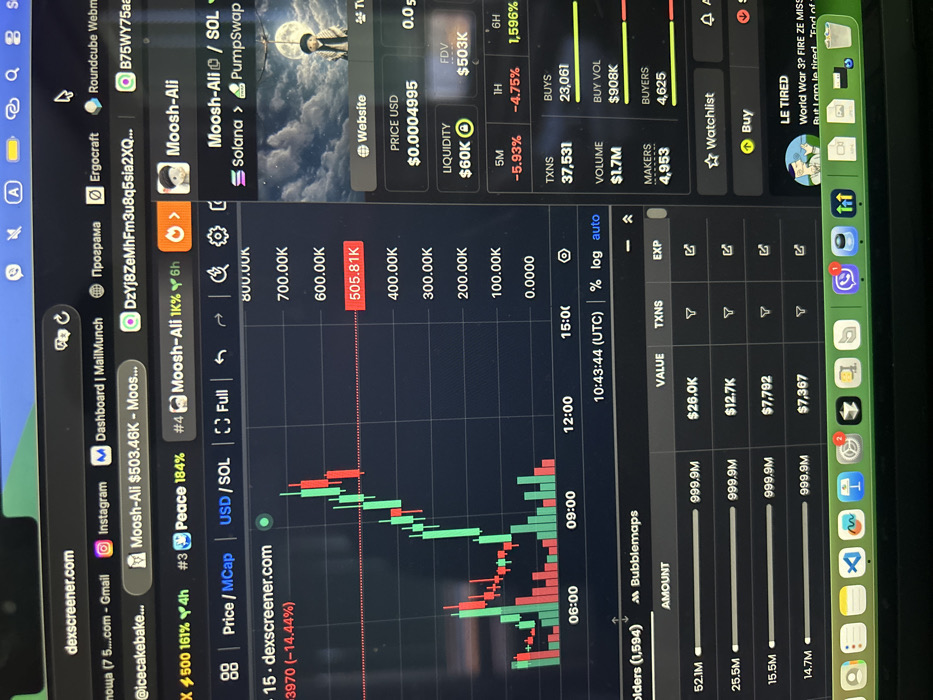 The image presents a close-up, slightly angled view of a laptop screen displaying a cryptocurrency trading interface from dexscreener.com. The screen exhibits minor glare and reflections. The web browser, likely Google Chrome, shows "dexscreener.com" in the URL bar. Open tabs include "MailMunch," "Ergocraft," "Roundcube Webmail," a tab partially visible as "Програма" (Program) in Cyrillic, and several tabs related to "Moosh-Ali" with associated financial figures (e.g., "$503.46K," "1K%") and "Peace 184%." Icons for Gmail and Instagram are also visible in the tab bar. The primary content on dexscreener.com is a candlestick chart depicting price fluctuations for a "USD / SOL" pairing. The chart displays time markers from "06:00" to "15:00 (UTC)" and a vertical axis scaled up to "800.00K," with a prominent red value of "505.81K" indicating a specific price point. Below the main chart, a "Holders (1,594)" section presents a table with columns for "AMOUNT," "VALUE," "TXNS," and "EXP," listing specific amounts such as "52.1M" with a value of "$26.0K." To the right of the chart, a panel details information for the "Moosh-Ali / SOL" token on "Solana" and "PumpSwap." A stylized image of a person in a top hat holding an orb against a moonlit, starry sky serves as the token's visual identity. Key financial data includes a price of "$0.0004995," "LIQUIDITY $60K," and "FDV $503K." Performance metrics show "5M -5.93%," "1H -4.75%," and "6H 1,596%." Transaction details indicate "TXNS 37,531," "BUYS 23,061," "VOLUME $1.7M," "BUY VOL $908K," "MAKERS 4,953," and "BUYERS 4,625." At the bottom of the screen, a macOS dock is visible, displaying application icons for programs such as Visual Studio Code, Telegram, System Settings, and WhatsApp, the latter showing a red notification badge. No individuals are present in the image. The environment outside the immediate screen area is not depicted. The physical location of the scene, including whether it is in Voluyak, Bulgaria, cannot be determined from the provided image.