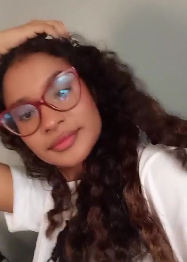 A young woman with curly brown hair is seen in a close-up shot, wearing large, red-framed glasses and a white T-shirt