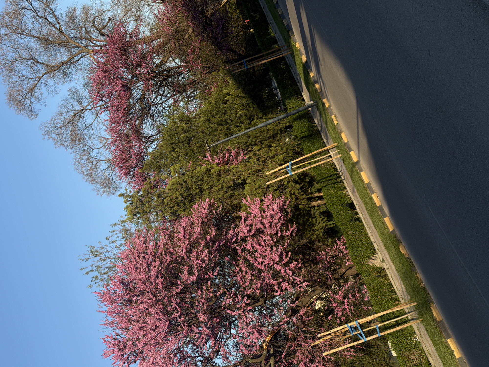 The image depicts a street scene in Septemvri, Bulgaria. On the left side, trees with pink blossoms are visible, interspersed with green foliage and some bare branches. A blue sky is partially visible behind the trees. On the right, a grey asphalt road is present, with a light-colored curb marked with yellow paint. Patches of green grass are adjacent to the curb. Support structures are visible next to the trees, consisting of wooden posts held together with blue straps. A large shadow extends across the road.