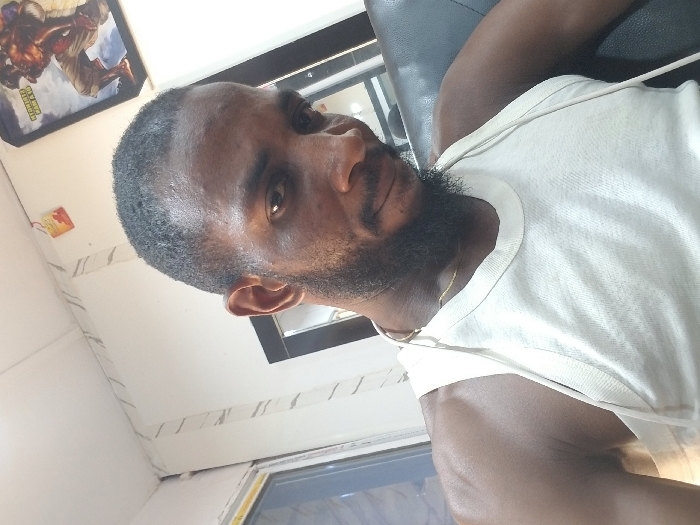 A close-up shot features a dark-skinned man with short, dark hair and a full beard. He is wearing a white sleeveless shirt. A gold chain is visible around his neck. The background includes a framed picture on the wall, a window, and a grey chair. The photo appears to be taken indoors, with the camera positioned at an angle.