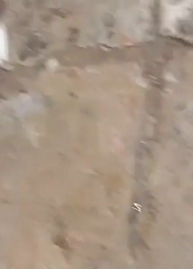 A child drags a calico cat by its tail across a concrete surface. The child is wearing a maroon shirt, jeans, and white shoes. The cat appears limp. The background is a cracked, mottled concrete surface with some visible debris.