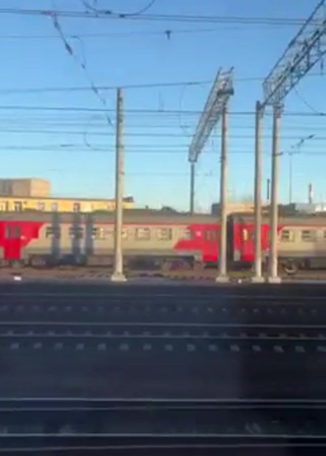 The video captures the view from inside a moving train. The camera is positioned to look out a window, offering a clear view of a parallel train track. On the adjacent tracks, a passenger train with a distinctive red and gray color scheme is visible. The train is stationary. Overhead, a network of power lines and support structures dominates the upper portion of the frame. The sky is a clear, bright blue, suggesting a sunny day. In the background, there is a nondescript industrial building and a distant smokestack. The movement of the camera relative to the other train indicates that the train the video is shot from is in motion.