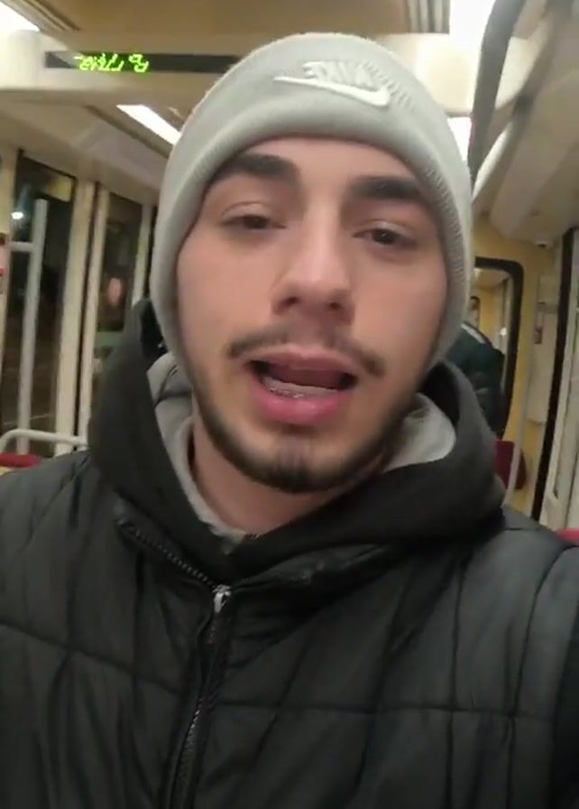 A young man wearing a grey Nike beanie and a black puffer jacket with a grey hoodie underneath takes a selfie on a moving train