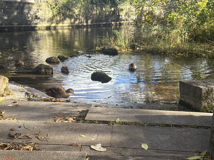 The image displays a section of a waterway, likely one of the canals or tributaries of the Amper River, within the city of Dachau, Germany, observed under bright daylight. In the immediate foreground, a concrete or stone bank slopes down to the water via wide, irregular steps. These steps exhibit minor structural imperfections and are sparsely covered with scattered autumnal leaves. A single mallard-type duck, characterized by mottled brown plumage, is situated on the lowest concrete step at the water's edge, oriented towards the right with its head lowered, possibly drinking or foraging. In the water, approximately five additional ducks are visible; one in the middle-right is partially submerged, appearing to dabble. Several dark, irregularly shaped rocks are present, some partially submerged in the shallow water, others at the water's edge. The far bank of the waterway is densely vegetated with green and yellowing foliage, including grasses and small shrubs. Behind this vegetation, a rough-hewn stone or concrete wall is partially visible. Bright sunlight illuminates the scene, casting shadows on the foreground steps and creating reflections of the sky and surrounding elements on the water's surface. No human individuals are present in the frame.
