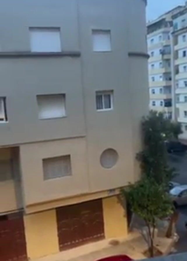 view from a balcony or high window of a street scene in what appears to be an urban area. The sky is overcast and gray. There are several buildings visible, including one with a rounded corner and a beige facade with brown doors at street level. Another building has a grid-like pattern of windows. Trees are seen in the foreground near the base of the building in focus. Several cars are parked along the street. The camera pans slightly upwards during the video.