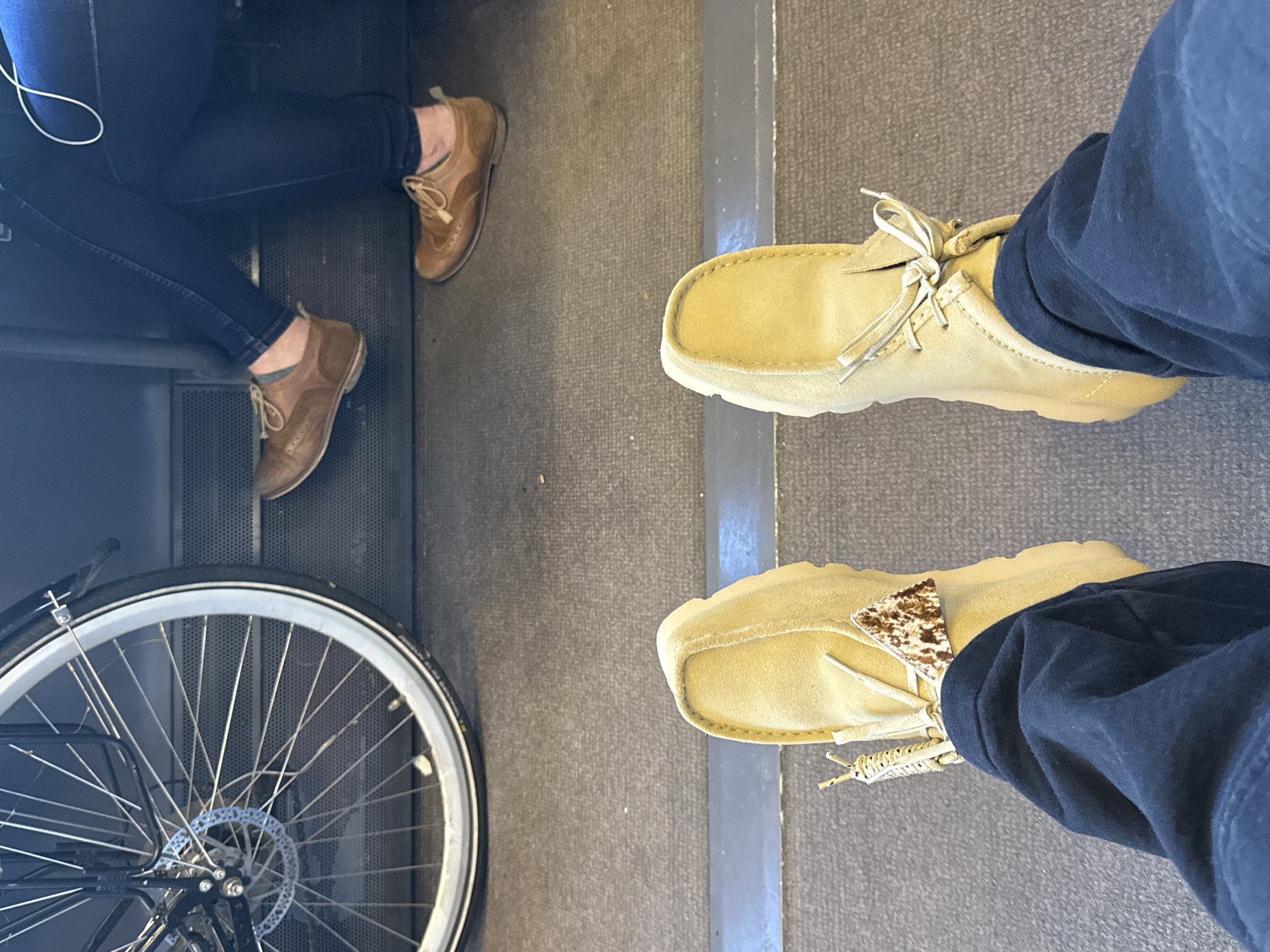 two sets of feet, one in brown lace-up shoes and the other in yellow moccasins, suggesting two individuals in proximity. Beside the brown shoes is a portion of a bicycle wheel, indicating transport. The setting appears to be an indoor area, possibly public transport like a train, given the gray flooring and partition or wall. The presence of the bicycle suggests it is on a mode of transport accommodating bikes. The location could possibly be London, United Kingdom.