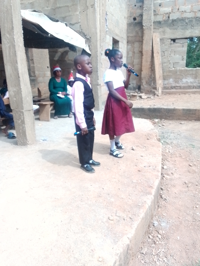 The scene depicts an outdoor event in Aramoko-Ekiti, Nigeria, featuring two children performing on a raised, unpaved platform. The ground consists of light brown packed earth and dirt. To the right, a young girl with dark skin and a ponytail wears a white short-sleeved top, a maroon pleated skirt, white socks, and white-and-black sandals. She holds a black microphone to her mouth with her right hand, appearing to speak or sing. To her left, a young boy with light skin and a bald head wears a light pink long-sleeved shirt, a black waistcoat, black trousers, and black slip-on shoes with white socks. He holds a blue-and-black microphone pointing downwards in his left hand. In the background, to the left, is a makeshift shelter with a corrugated metal roof supported by concrete pillars. Under this shelter, an adult female with dark skin, wearing a dark green dress and a red-and-white Santa hat, sits on a wooden bench. She holds a piece of paper in her hands. Another individual, partially visible, also wears a red Christmas hat nearby. Further left, parts of another person are visible. The far background features an unfinished building constructed from concrete blocks, exhibiting exposed masonry and some plasterwork. Openings indicate window or door frames. Sparse vegetation is visible beyond the unfinished structure. The overall environment suggests an informal outdoor gathering or performance.