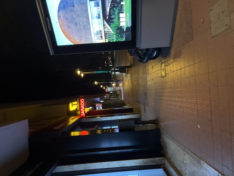 This is a nighttime, eye-level street view captured on a sidewalk along a commercial street in València, Spain, likely a section of a Gran Vía. The urban environment is illuminated by artificial light sources, and the ground appears damp or wet. In the foreground to the right, a large, dark JCDecaux advertising billboard stands vertically. Its illuminated screen displays an image of the Planetarium Galileo Galilei in Buenos Aires, Argentina, along with the text "VISIT BUENOSAIRES". Partially obscured behind the billboard's base is the rear wheel and a section of the dark body of a scooter or motorcycle. The reddish-brown tiled sidewalk, spanning the lower half of the frame, is reflective due to dampness, showing linear patterns from overhead light. Several metal utility access plates are embedded in the sidewalk. To the left, the facade of a building features a dark storefront with a light blue reflective surface on the far left. A black utility box is fixed against the building wall. Further down the street, a commercial establishment displays multiple illuminated signs. A prominent yellow and red neon sign displays the word "SÁBADO". Adjacent to it, a stylized yellow 'G' is visible, likely part of a "GRAN VIA" sign. Other commercial storefronts with interior lighting line the street on the left, receding into the distance. Along the street on the right, a series of tall, dark streetlights with multiple amber-glowing lamps illuminate the roadway and the far side of the sidewalk. The street itself also appears damp, reflecting distant vehicle headlights and streetlights. The background features the continued expanse of the street and commercial buildings, fading into the dark night sky. No individuals are clearly visible in the scene.