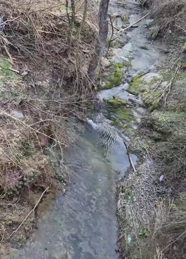 The video depicts a small, shallow stream flowing through a wooded area. The stream bed is rocky, with some moss and algae visible on the rocks. The water is clear but appears slightly murky. The stream is bordered by dense vegetation, including bare trees, bushes, and dried foliage. The scene appears to be captured from an elevated position, providing a view looking down the stream's course. There are no people or animals visible in the video.