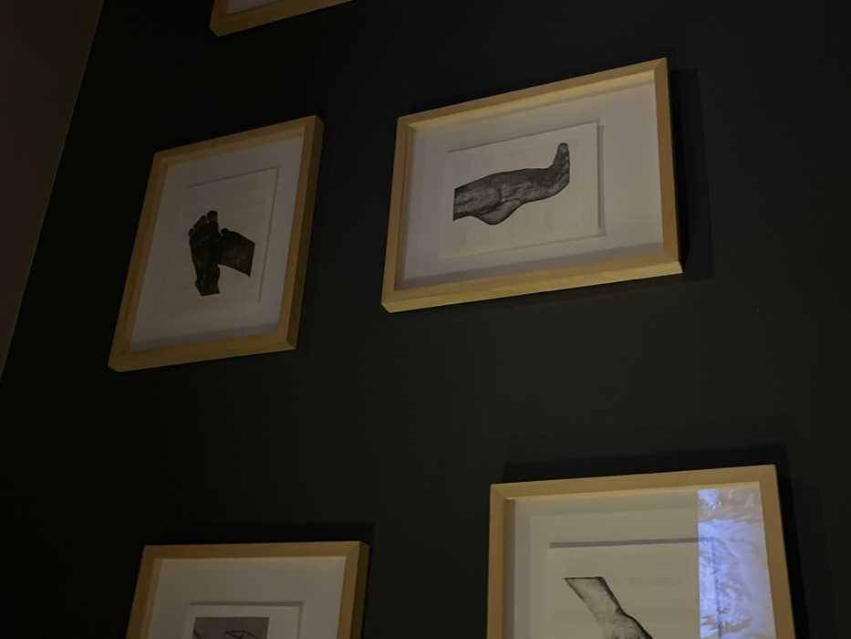 The image depicts an interior wall, painted in a dark charcoal or deep grey color, located within the city of Stara Zagora, Bulgaria. Hung upon this wall are four wooden-framed artworks, arranged in a staggered vertical and horizontal alignment. The frames are light-colored wood, possibly pine or oak, and each encases a white mat board surrounding a central black and white or grayscale print. Specifically, the top right frame displays a print of a human hand, possibly clenched into a fist. The bottom right frame presents a print of a human foot and lower leg, depicted from a profile view, highlighting anatomical detail. The top left frame is partially visible, showing a segment of what appears to be another anatomical study or abstract form. The bottom left frame, also partially visible, displays a print with a bright, horizontal, blue-tinted reflection across its lower portion, obscuring part of the artwork. No people are visible. The scene is static, showcasing wall-mounted art in what appears to be a gallery, residential, or commercial setting.