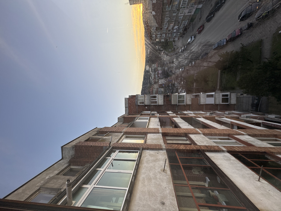 The image presents an elevated, oblique view of an urban street scene in Lovech, Bulgaria, observed at what appears to be sunset. The left side of the frame is dominated by the concrete and reddish-brown brick facade of a multi-story residential building, featuring multiple windows, some enclosed with white frames, and balconies. A metallic drainpipe is visible on the upper left section of this building, and two horizontal metal rods protrude from a lower concrete wall. To the right of this structure, an asphalt road extends into the background, flanked by sidewalks and bare deciduous trees. Numerous parked passenger vehicles of varying colors, including dark, red, and white, line both sides of the street. A few indistinct pedestrians are visible on the sidewalks. Across the road, another row of multi-story residential buildings, exhibiting similar architectural styles, parallels the street. In the background, vegetated hills rise above the urban landscape. The sky transitions from a light blue overhead to a golden-orange hue at the horizon on the right, where the sun's rays are distinctly visible. A faint airplane contrail is present in the upper right sky.