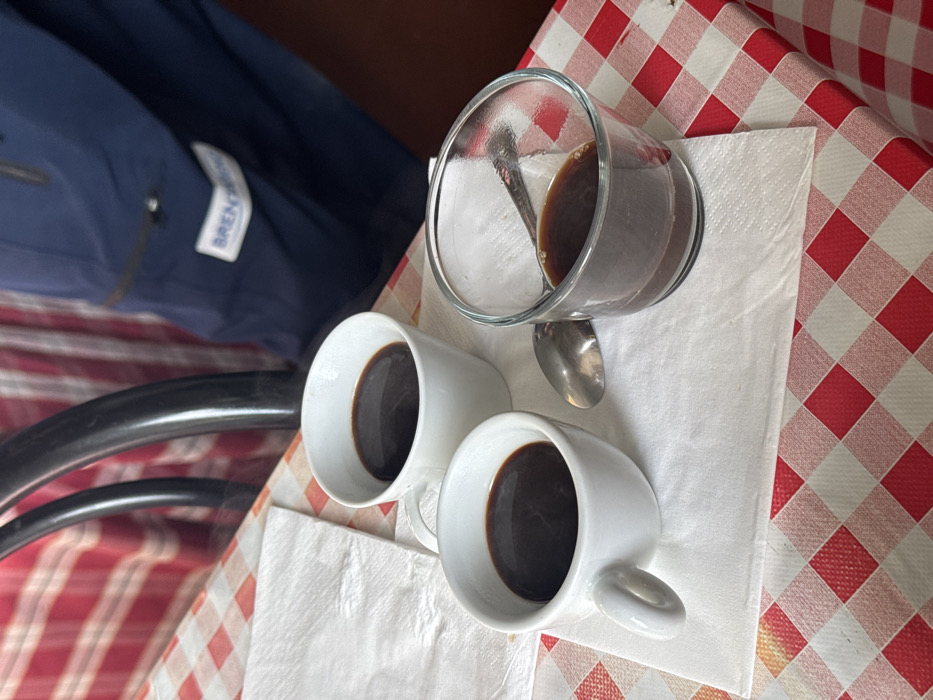 The image displays a tabletop scene within an establishment located in Cortona, Italy, likely a cafe or restaurant. The table is covered with a red and white checkered tablecloth. A white, rectangular paper napkin is placed on the tablecloth. Upon the napkin, two white ceramic espresso cups are visible, each containing a dark, viscous liquid, consistent with coffee. To the right of these cups, a clear glass, cylindrical vessel holds a similar dark liquid, filling approximately one-third of its volume, with a small silver-colored metal spoon immersed within it. Another identical metal spoon rests on the napkin between the two white espresso cups. In the background, a dark, curved chair frame is partially visible. Behind the chair, the torso of an individual is seen, wearing a dark blue garment that appears to be a uniform or scrub top, featuring a white label with the text "BRENTWOOD". Another individual wearing a red and white striped shirt is partially observable in the far background. No direct actions or interactions among people are depicted.