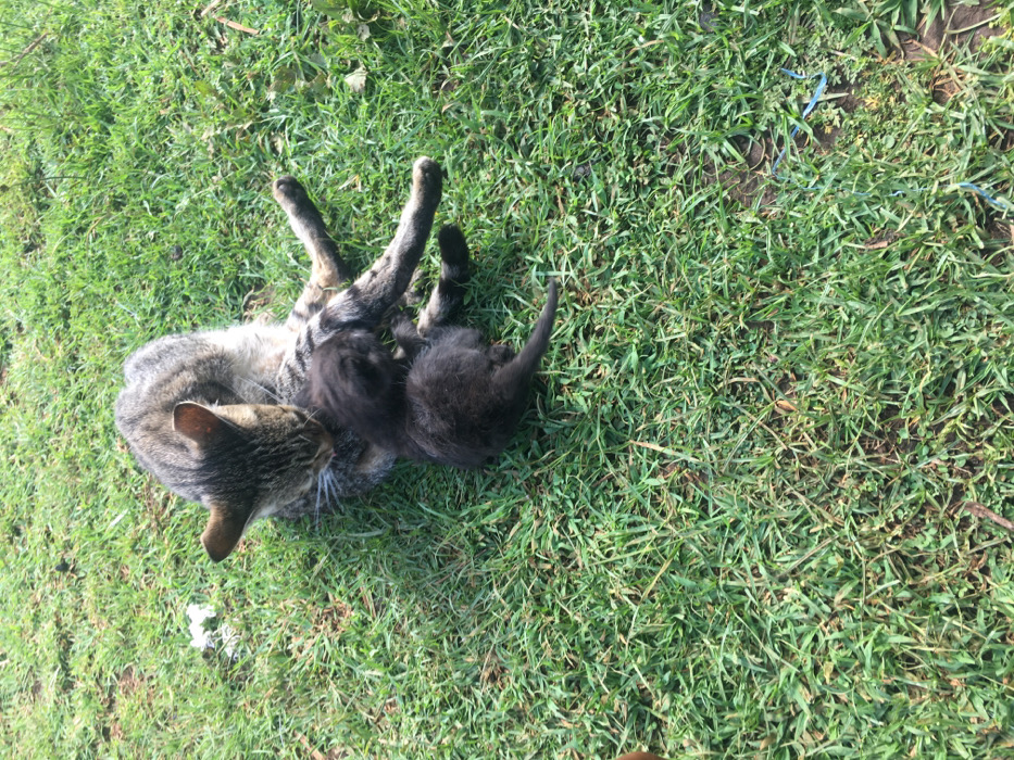 - "In Ndeiya, Kenya, a tabby cat with gray and brown striped fur is observed lying on its left side on green grass" by FM-3ILLF2, licensed under CC BY 4.0