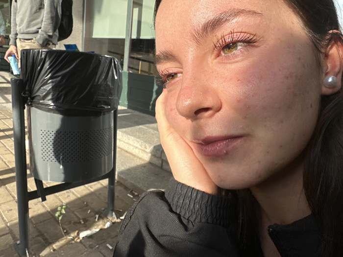 A young female with dark hair, fair skin, and a pearl earring occupies the right half of the frame, looking left with her right hand supporting her chin. She wears a dark, zippered top. Strong sunlight illuminates her face from the left. To her left, in the mid-ground, stands a grey, perforated metal public trash can with a black plastic liner. Behind the trash can, a male subject in a grey hooded sweatshirt and tan pants holds a light blue carton. The ground is paved with light-colored tiles, and discarded cigarette butts and a small green plant are visible near the base of the trash can. A building with a light-colored facade and dark green window or door frames is in the background. The scene is an outdoor urban environment in the city of Madrid, Spain.