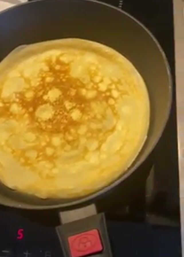 A person is cooking crepes in a grey frying pan on an electric stovetop