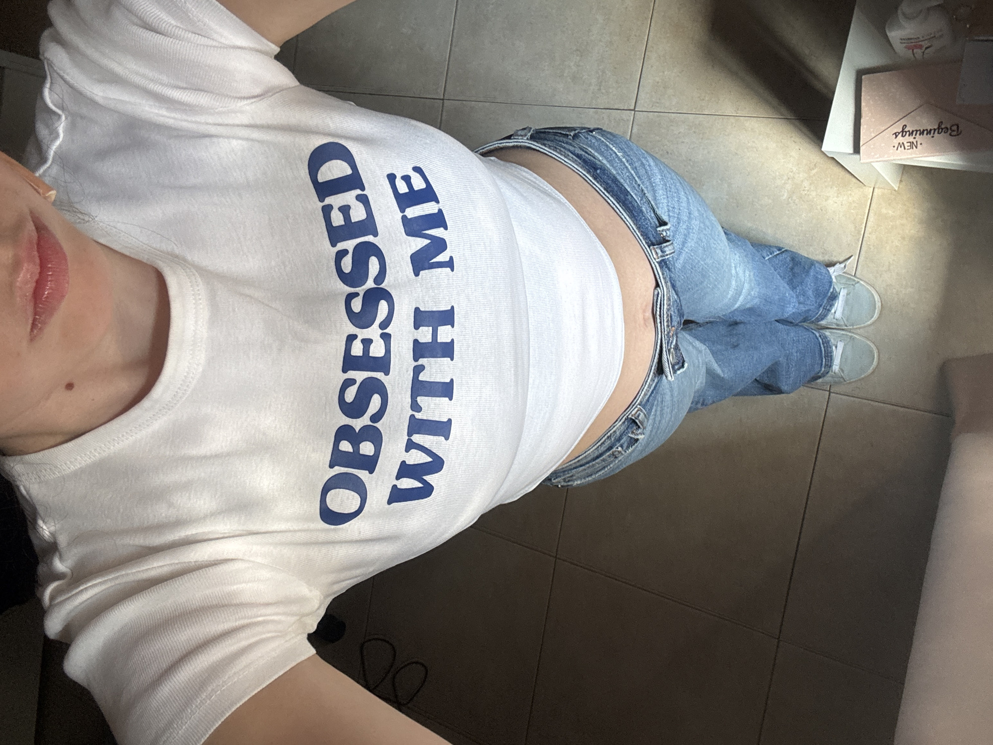 The image displays a high-angle, downward view of an individual standing indoors, presenting their torso and lower body. The specific location within Sofia, Bulgaria, cannot be determined from the visual evidence provided; it appears to be a generic indoor setting. The subject is a person with light skin, partially visible from the lower lip and chin down to the feet. A small, dark mole is present on the upper right chest/shoulder area. The individual is wearing a white, short-sleeved, form-fitting crop top with a rounded neckline. The words "OBSESSED WITH ME" are printed in dark blue, capital, sans-serif letters across the chest. The bottom hem of the crop top is positioned above the navel, revealing a portion of the midriff. Below the crop top, the subject wears light blue denim jeans with a visible waistband. Their feet are clad in light grey/blue canvas sneakers with white laces and white soles. The floor is composed of large, light brown or greyish-brown square tiles with visible grout lines. To the left of the subject, the background is dark and out of focus, with indistinct dark, circular shapes visible. To the right, near the bottom corner, several items are present: a light-colored box or container, a small pink object resembling a notebook or card with the partial inscription "NEW Beginnings" in a script font, and a white bottle or dispenser. The lighting suggests an indoor environment, casting subtle shadows. The subject appears to be standing still, possibly posing for a photograph.