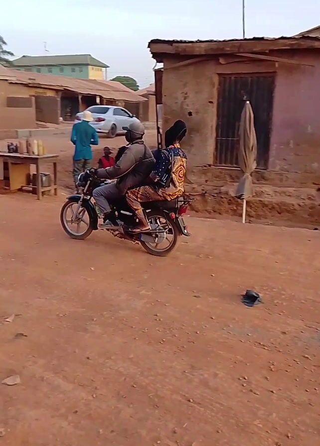 Two people ride a black motorcycle down a dirt road in a small village. The driver wears a gray cap and the passenger wears a colorful outfit and head wrap. As they pass a group of people sitting and standing on the side of the road, another motorcycle comes behind them. The road is reddish-brown dirt, and the buildings are mostly brown and made of clay or brick. There are electrical wires running across the sky. The sky is a hazy blue.