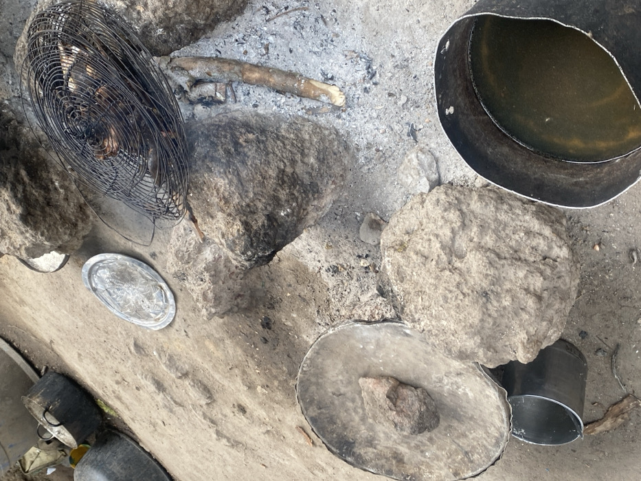 A rudimentary outdoor kitchen. Three rocks form a makeshift stove. Atop the rocks is a wire cage covering something cooking. A large metal container, partially filled with liquid, sits nearby. A piece of wood and ash suggest recent fire usage. A shallow metal dish, a metal container, and a stone table with a small rock on top rest on the dirt floor, along with other various containers.