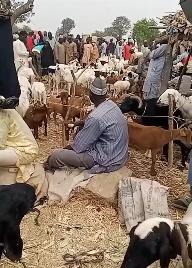 busy animal market, likely in a rural setting. Many people are milling around, dressed in a variety of traditional and casual clothing. The main focus is on the goats and sheep, which are being inspected and potentially traded. There are goats of various colors, including white, brown, and black, some tied to stakes or held on leashes. Men are seen sitting and standing around the animals, seemingly engaged in conversation and negotiation. The ground is covered with dry grass and straw. The weather seems overcast, with a few trees visible in the background. The scene appears crowded and lively, typical of a market setting.