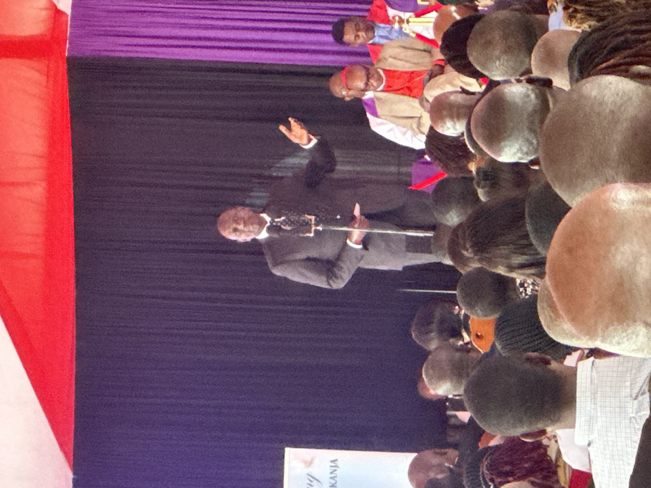 An indoor event is depicted in Unknown, Kenya. A Black male, dressed in a dark suit and patterned tie, stands centrally on a stage, addressing an unseen audience. He holds a microphone on a stand with his left hand, and his right hand is raised in a gesturing motion. Behind him to the right, three additional Black males are seated. One older male wears a light brown jacket over a red garment with a purple stole, looking downwards. The other two are partially visible, wearing white and blue garments respectively, both with purple stoles. The stage backdrop consists of dark purple curtains, with red fabric draping the ceiling. To the left of the speaker, a partial banner with the text "ng" and "KANJA" is visible. In the foreground, numerous audience members, predominantly Black individuals, are seated with their backs to the camera, facing the stage.