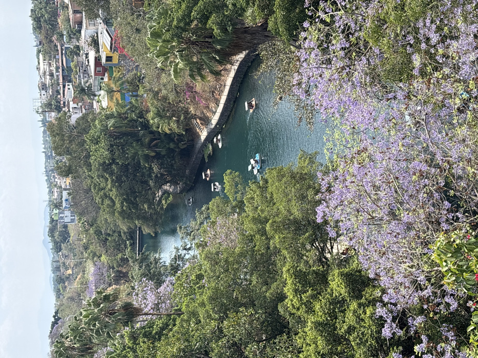 This elevated wide-angle image captures a recreational waterway, identified as a section of a barranca in Cuernavaca, Mexico, specifically likely part of the Barranca de Amanalco system. The blue-green waterway flows diagonally through the frame from the upper-left towards the lower-right. Seven paddle boats, predominantly light-colored with one blue vessel, are visible on the water; each appears occupied by one or two individuals. The immediate foreground is dominated by dense foliage and the purple blooms of Jacaranda trees, partially obscuring the water. Both banks of the waterway are lined with a thick canopy of varied trees, including large green deciduous trees and palm trees. A paved path or walkway, incorporating steps, follows the contour of the right bank. In the mid-ground, a dark-colored bridge spans the waterway. The background features an urban environment of residential or commercial buildings, exhibiting diverse colors (red, yellow, white, blue) and architectural styles, ascending a hillside. Several buildings display rooftop solar panels. Distant hills are visible beneath a clear, light blue sky. Utility poles and a prominent billboard structure are discernible against the distant horizon. The scene is illuminated by strong natural daylight.