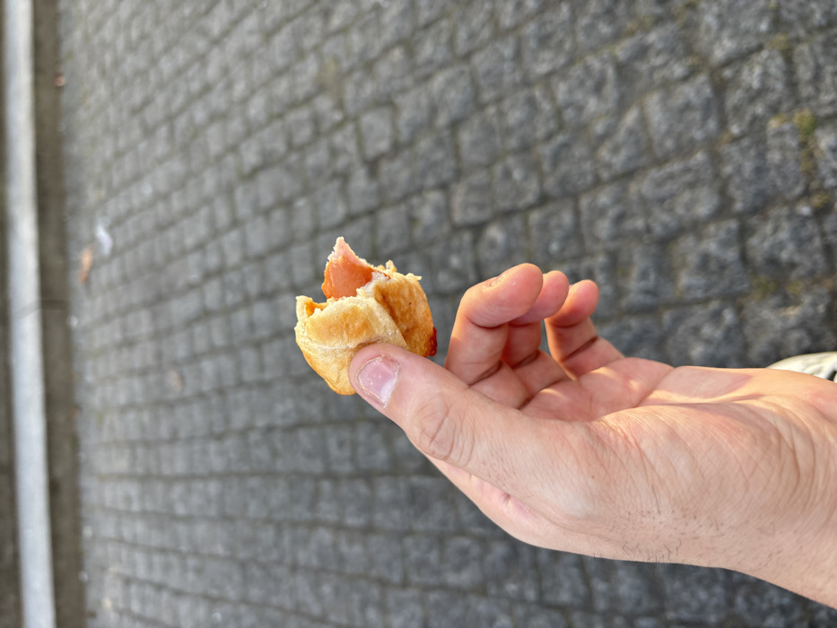 A close-up photograph captures a light-skinned adult's hand, illuminated by warm sunlight from the right, holding a partially consumed small, golden-brown pastry. The pastry, likely a mini croissant or puff pastry, exhibits a bite taken from its side, revealing a pinkish-orange filling, possibly smoked salmon. The background consists of gray cobblestone pavement with rectangular stones laid in a repeating pattern. A light gray concrete or stone step or ledge is visible in the upper background. The scene is set outdoors, in a public area within the city of Dresden, Germany. No other individuals or noteworthy objects are present.