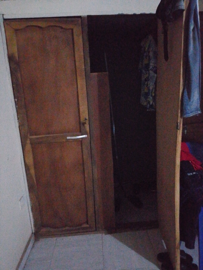 An open wooden closet door reveals a dark interior with clothes hanging inside. A closed wooden door stands adjacent to it. The closet doors are brown. Clothes are visible inside the closet and draped on the side of the open door, including a red garment and jeans. The floor is tiled. The walls are off-white.