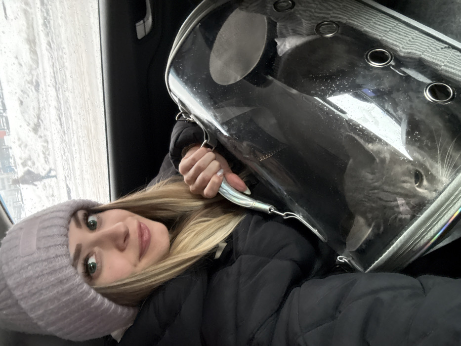 An image captured inside a vehicle in Reutov, Russia, depicts a woman and a cat