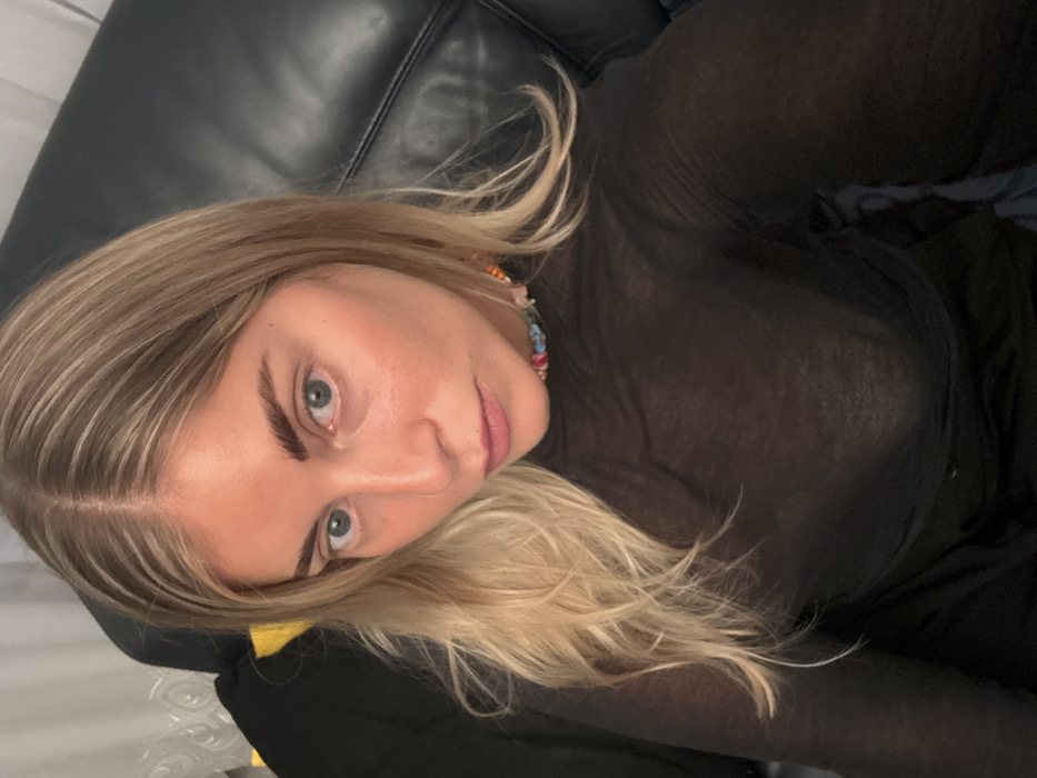 The image displays a close-up, chest-up view of a female individual, photographed indoors in Wattrelos, France. The subject has long, wavy blonde hair with darker roots, parted centrally, and blue eyes. Her facial skin shows a fair complexion with a slight tan. She wears a sheer, black, long-sleeved top through which the outline of her torso, including the nipples, is discernible. A multi-colored beaded necklace, featuring shades of orange, blue, pink, yellow, and green, is around her neck. She maintains direct eye contact with the camera. The background consists of a black upholstered surface to the subject's right and a lighter-colored wall or curtain with a subtle pattern to her left, with a partial yellow object visible on the far left.