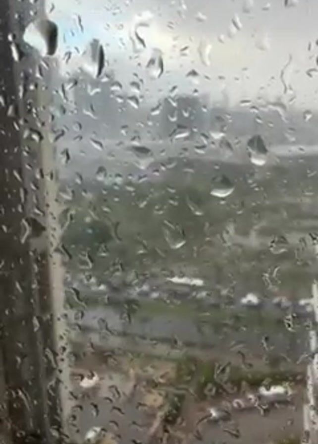 view through a window covered in raindrops. Outside the window, the scene is blurred by the rain, but it appears to be an urban or suburban landscape with buildings, trees, and streets. The sky is overcast and gray. The raindrops on the window obscure the view, creating a distorted and impressionistic effect. There are no people visible in the video.
