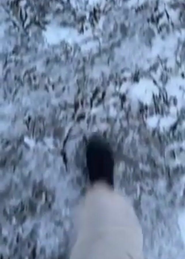 A person wearing light-colored pants and black boots walks through a snowy landscape. The ground is covered in snow, partially obscuring vegetation underneath. The camera is positioned looking downward, capturing the person’s movement from their perspective. The person is stepping over patches of snow-covered brush and foliage.