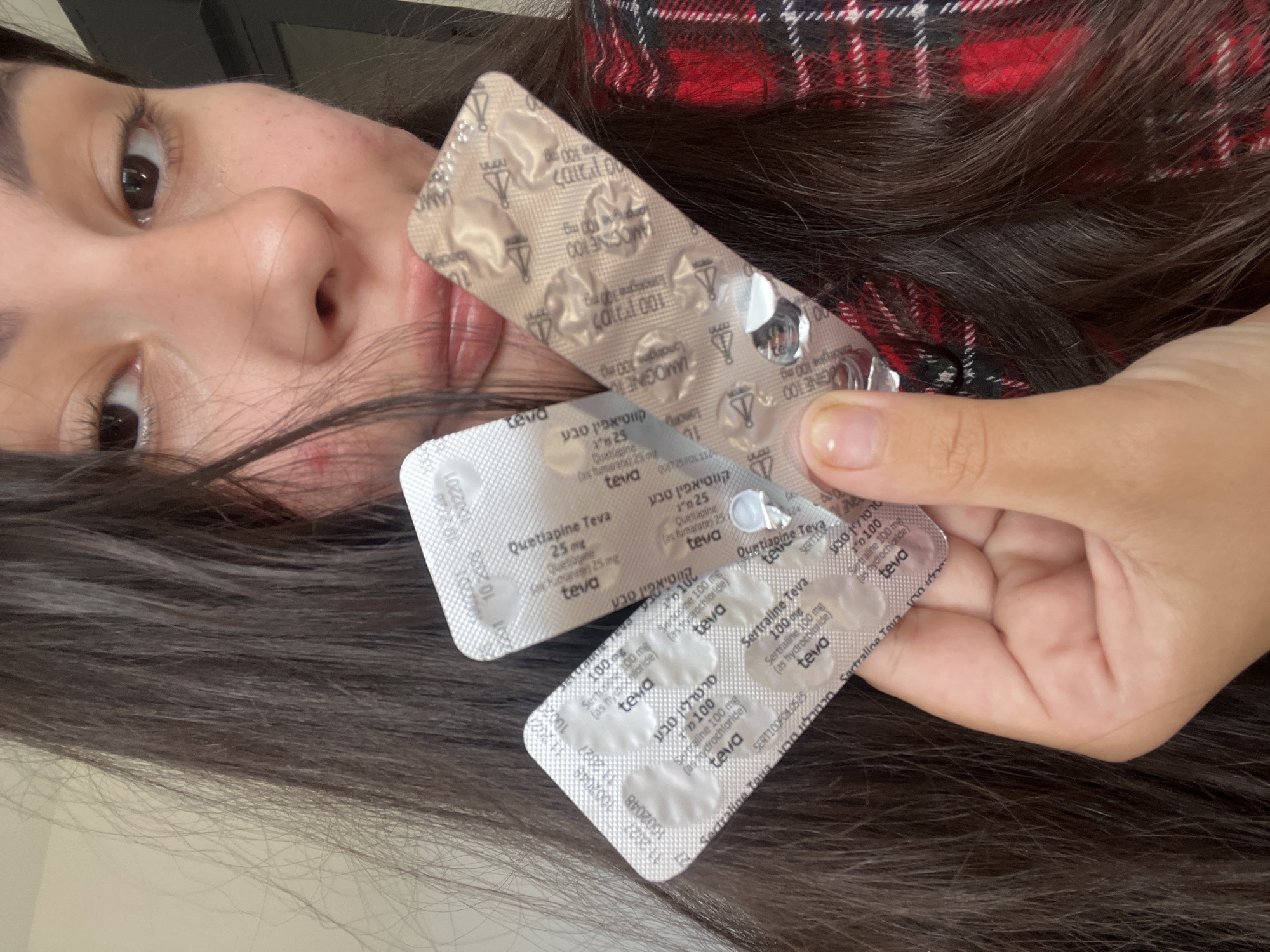 A person, presumably female, is holding three blister packs of medications. The medication labels are in both Hebrew and English, indicating these are pharmaceuticals sold in Israel. The names of the medications are: Lamotrigine 100 mg, Quetiapine Teva 25 mg, and Sertraline Teva 100 mg. One pill has been removed from the Lamotrigine blister pack. No information about Kiryat Bialik, Israel is present in the provided text.