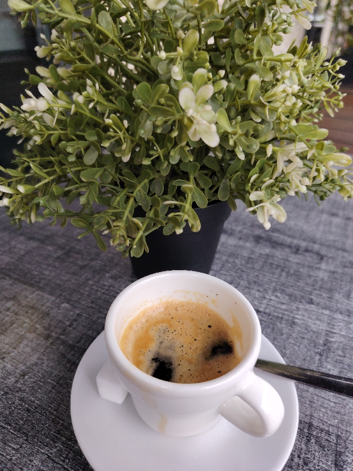 - "A close-up, slightly elevated shot captures an espresso cup, a sugar cube, and a potted plant on a dark gray, textured surface, likely indoors at a location in Strasbourg, France" by FM-Odse83, licensed under CC BY 4.0