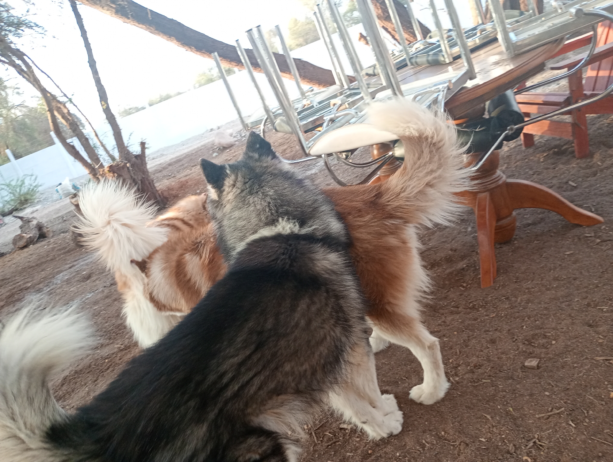 two Alaskan Malamute dogs in Pozo Almonte, Chile. One is primarily black and gray, and the other is tan and white. They are standing on brown, compacted earth, possibly dirt or clay. In the background, there are tables and chairs, some of which are stacked upside down. There are trees and what appears to be a body of water in the distant background. The lighting suggests it is daytime. The scene appears to be outdoors.